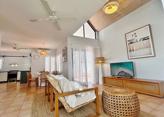 queen, shower, toilet, tub, twin/ single, reefs, restaurants, Smart TV, Air Conditioning, Clothes Dryer, Linens Provided, Living Room, Parking, Towels Provided, Washing Machine, Wifi, Coffee Maker, Dishes & Utensils, Dishwasher, Kitchen, Microwave, Oven, Refrigerator, Stove, Toaster, Dining Table, bird watching, photography, scenic drives, sight seeing, walking, ATM/bank, groceries, medical services, Near The Ocean, Balcony, Deck / Patio, Lawn / Garden, Fenced Pool, Fenced Yard, Private Pool, fishing, snorkeling, surfing, swimming, children welcome, pets not allowed